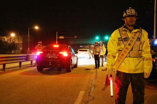 경기 포천시는 최근 육군 제7기동군단 예하 제8기계화보병사단과 함께 ‘4월 음주폐해 예방의 달’을 맞이해 ‘군·경합동 음주단속’을 실시했다. 사진은 야간 음주단속에 참여한 군·경 관계자들이 통행차량을 대상으로 음주측정을 하고 있는 모습. (사진제공=포천시청)