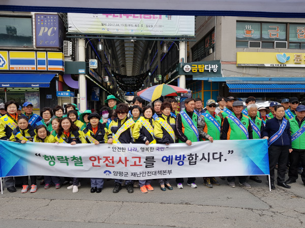 경기 양평군이 최근 행락철을 맞아 양수리 전통시장에서 양평소방서, 양평군여성단체협의회, 지역자율방재단, 안전모니터봉사단 등 약 100명과 함께 ‘제265차 안전점검의 날 캠페인’을 펼쳤다. 사진은 시장 입구에서 캠페인을 펼치고 있는 봉사자들의 모습. (사진제공=양평군청)