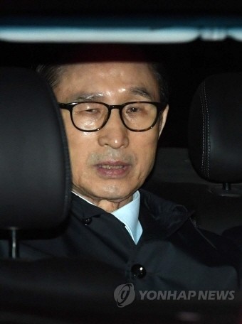 110억원대 뇌물 수수와 340억원대 비자금 조성 등 혐의로 구속영장이 발부된 이명박 전 대통령이 23일 서울 강남구 논현동 자택에서 나와 서울동부구치소로 향하고 있다.