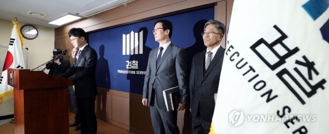 한동훈 서울중앙지검 3차장검사가 9일 오후 서울중앙지검에서 110억원대 뇌물수수 의혹 등으로 구속된 이명박 전 대통령에 대한 구속 기소와 중간 수사 결과를 발표하고 있다.
