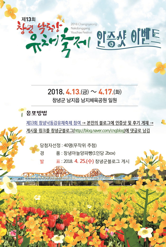 군 관계자는 “인증샷이벤트가 최근 5년 연속 경상남도 지정 우수 문화관광축제로 선정된 창녕낙동강유채축제를 찾는 관광객들의 흥미를 유발하고 축제를 찾는 즐거움을 더할 수 있기를 기대한다.”고 밝혔다.