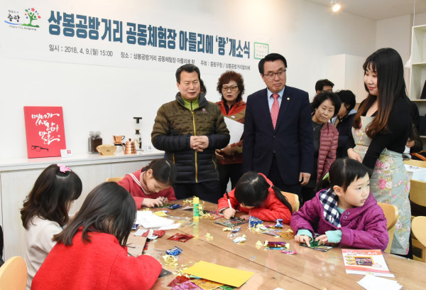 중랑구는 9일 상봉공방거리 공동체험장 아틀리에 ‘랑’ 개소식을 개최했다. 사진은 개소식에 참석한 구청장 및 관계자들이 포일아트 체험을 하고 있는 어린이들을 지켜보고 있는 모습. (사진제공=중랑구청)