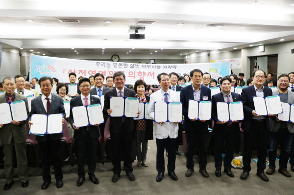 경기 부천시는 최근 순천향대학교 부천병원에서 ‘제46회 보건의 날’ 기념행사를 개최했다. 이날 행사에는 '사전연명의료의향서 작성 퍼포먼스'도 진행됐다. 사진은 참여자들이 작성한 사전연명의료의향서를 들고 기념촬영을 하는 모습. (사진제공=부천시청)