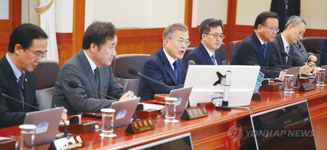 문재인 대통령이 10일 오전 청와대에서 열린 국무회의에서 발언하고 있다. 문재인 대통령은 10일 "지난주 일부 아파트 단지에서 폐비닐과 페트병 등 재활용 폐기물이 제대로 수거되지 못하면서 큰 혼란이 있었다"며 "국민께 불편을 끼쳐드려서 송구스러운 마음"이라고 말했다.