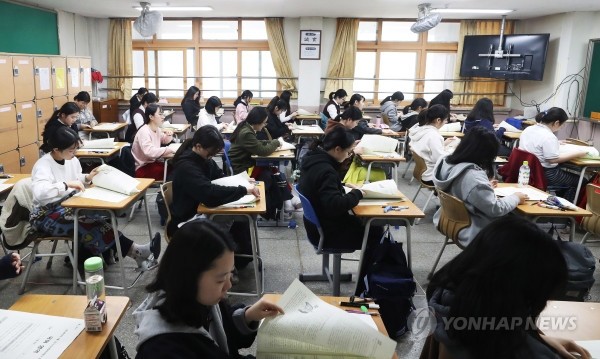 올해 두 번째 전국연합학력평가가 실시된 11일 오전 경기도 수원시 영통구 효원고등학교에서 3학년 학생들이 1교시 국어영역 문제를 풀고 있다.