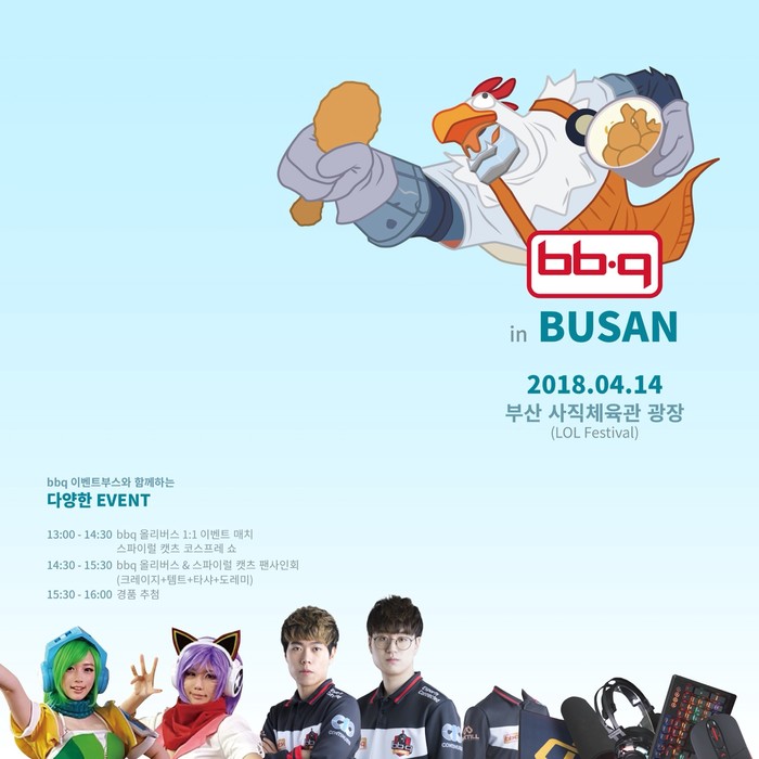 BBQ는 LOL 프로팀 ‘BBQ 올리버스’ 선수들과의 1대1 대전, 스파이럴 캣츠의 코스프레와 사인회, 경품 증정 등 다채로운 행사를 진행해 결승전을 찾은 LOL 팬들에게 축제의 장을 마련할 계획이다.