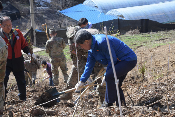 경기 동두천시는 11일 송내동 산80-5번지에서 식목일 우천으로 연기됐던 '제73회 식목일 기념 나무심기 행사'를 개최했다. 사진은 참여자들이 나무를 식재하고 있는 모습. (사진제공=동두천시청)