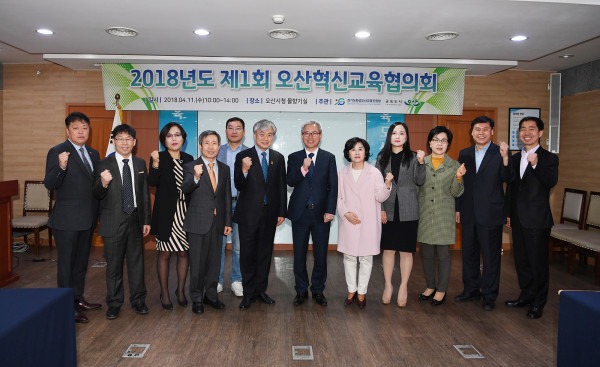 경기 오산시와 화성오산교육지원청은 11일 시청 물향기실에서 시청 및 교육지원청, 학교 관계자와 학무모 등이 참석한 가운데 ‘2018년 제1회 오산혁신교육협의회’를 개최했다. 사진은 협의회에 참석한 관계자들이 기념촬영을 하는 모습. (사진제공=오산시청)