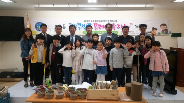 경기 여주시 오학동이 지난 12일 오학초등학교 행복나눔실에서 초등학생들에게 전통도자예술 체험의 기회를 제공하는 ‘빙글빙글 물레야 놀자’ 수업의 개강식을 개최했다. 사진은 개강식에 참석한 초등학생 등 관계자들이 기념촬영을 하는 모습. (사진제공=여주시청)