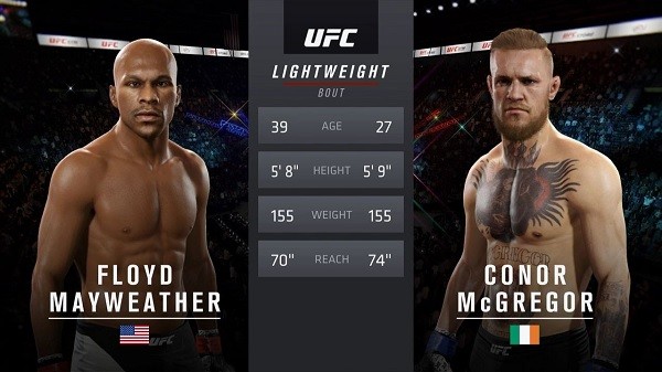 | ▲ UFC 맥그리거가 복싱 역대 최강자 메이웨더의 종합격투기 데뷔전 상대가 되는 상황을 UFC 공식 게임을 통해 구현한 장면 | ||