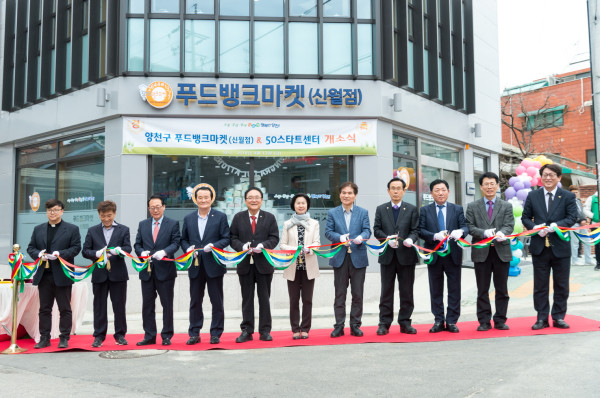 서울 양천구는 지난 13일 오후 푸드뱅크마켓 신월점에서 진행된 ‘양천구 푸드뱅크마켓 신월점 & 50스타트센터 개소식’을 개최했다. 사진은 행사에 참석한 관계자들이 테이프커팅에 앞서 기념사진 촬영을 하는 모습.(사진제공=양천구청)