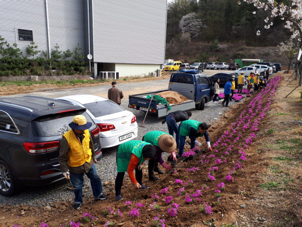 경기 용인시 기흥구 동백동은 최근 청사 주차장 법면 72㎡에 꽃잔디 1800본을 심어 꽃밭을 조성했다. 이날 참가자들은 청사 앞 인도변에 놓인 화분 9개에도 메리골드 324본을 심어 꽃길을 조성했다. 사진은 꽃잔디를 식재중인 참여자들 모습.(사진제공=용인시청)