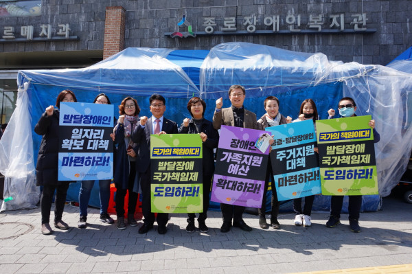 청와대 앞에서 시작된 천막농성은 지난 2일부터 ▲발달장애 국가 책임제 ▲발달장애인 주간활동서비스 제도화 ▲중증장애인직업재활지원 사업 확대 ▲장애인 가족지원 체계 구축 ▲발달장애인 자조단체 운영 활성화 등 5가지의 정책제안 및 예산을 정부에 요구하며 농성을 이어왔다.