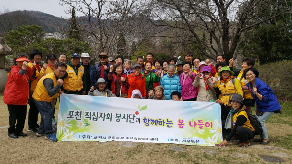 경기 포천시 중부희망복지센터는 지난 13일 포천적십자회봉사단의 자원봉사 지원을 받아 40여명의 노인들이 참석한 가운데 내촌면에 위치한 서운동산에서 ‘봄나들이 행사’를 개최했다. 사진은 행사에 참석한 노인들이 기념촬영을 하는 모습. (사진제공=포천시청)