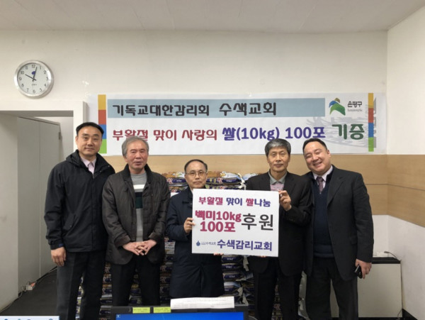 서울 은평구에 소재한 수색감리교회는 소외된 이웃에 대한 배려와 사랑을 실천하기 위해 최근 수색동 주민센터에 쌀 10kg 100포를 기부했다. 사진은 관계자들이 기념촬영을 하는 모습. (사진제공=은평구청)