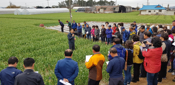 경기 안성시 농업기술센터는 지난 13일 생활개선회와 농촌지도자들이 참석한 가운데 충남 태안군 농업기술센터를 방문, 지역내 경작지를 견학한 후 마늘·양파에 대한 교육을 받았다. 사진은 경작지 견학에 참석한 관계자들이 설명을 듣고 있는 모습. (사진제공=안성시청)