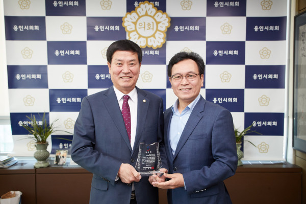 경기 용인시의회는 최근 한국척수장애인협회에서 박만섭 의원에게 수여한 감사패를 전달했다. 앞서 척수장애인협회는 고찬석, 박만섭, 유향금, 이은경 의원에게 감사패를 수여한 바 있다. 사진은 감사패를 받은 박만섭 의원(사진 왼쪽)의 모습. (사진제공=용인시의회)