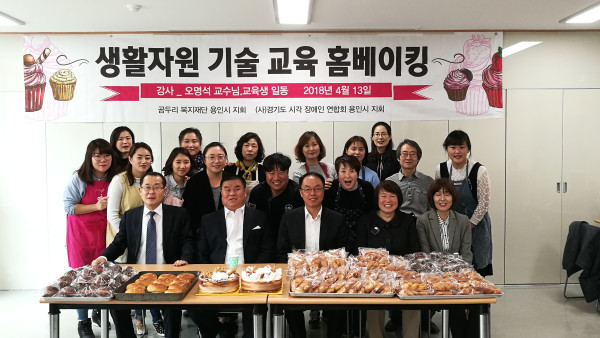 경기 용인시는 지난 13일 농업기술센터 생활자원기술교육 ‘생활속 홈베이킹’ 수업에 참여한 수강생들이 직접 만든 빵 300개를 시각장애인연합회 용인시지회에 기부했다. 사진은 빵 기부에 앞서 홈베이킹 수강생 및 관계자가 기념촬영을 하는 모습. (사진제공=용인시청)