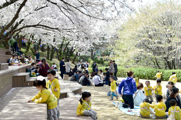 최근 서울 서대문구 안산(鞍山) 연희숲속쉼터 벚꽃마당을 찾은 어린이들이 벚꽃비를 맞으며 즐거워하고 있다. 구는 지난 12~15일 안산자락길 벚꽃음악회를 마련하고 시민들을 맞았다. (사진제공=서대문구청)