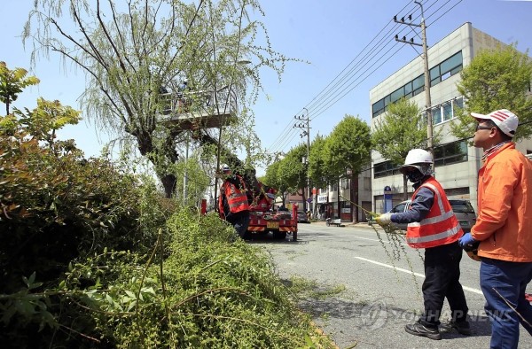 17일 오전 광주 북구 임동 양동교-발산교 구간에서 광주 북구청 공원녹지과 직우너들이 봄철 꽃가루 등으로 인한 각종 질병을 예방하기 위해 가지치기 작업을 하고 있다.