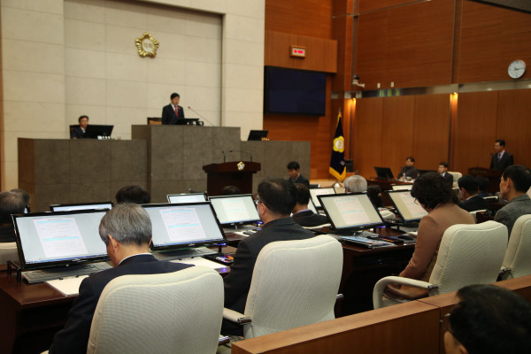 | ▲ 제207회 임시회에서 종이서류 없이 본회의가 진행되고 있다. (사진제공=금천구의회) | ||