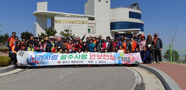 경기 광주시 재향군인회는 최근 국가안보 의식을 고취하기 위해 향군회원, 여성회원, 자문위원 등 90명의 회원과 함께 전반기 안보현장 견학을 다녀왔다. 사진은 강화도 평화 전망대를 방문한 향군회원 등이 기념촬영을 하는 모습. (사진제공=광주시청)