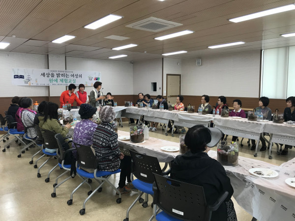 한국여성농업인 경기 용인시연합회는 18일 기흥구 구성동 주민센터 회의실에서 지역내 저소득 취약계층 여성을 대상으로 원예체험교실을 운영했다. 사진은 원예체험교실에 참여한 관계자들이 화병에 다육식물을 식재하는 방법을 배우고 있는 모습. (사진제공=용인시청)