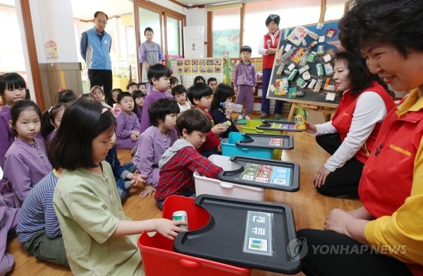 19일 강원 춘천시 동면 다은어린이집에서 열린 '찾아가는 재활용 체험교실'에서 어린이들이 재활용품 분리배출 방법을 배우고 있다.