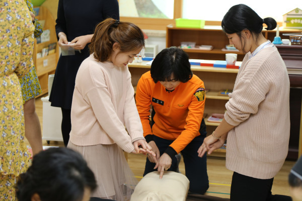 서울 영등포소방서는 18일 오후 신길동 소재 대방 성모유치원 교직원을 대상으로 시민안전파수꾼 양성교육을 실시했다. 사진은 참여자들이 심폐소생술 실습을 하고 있는 모습.(사진제공=영등포소방서)