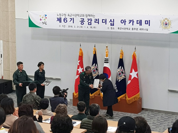 서울 노원구는 19일 오후 4시 육군사관학교에서 ‘육사와 함께하는 제6기 공감 리더십 아카데미 수료식’을 개최하고, 수료한 62명이 수료생에게 육사교장 명의의 수료증을 수여했다. 사진은 수료생들이 수료증을 수여받고 있는 모습.(사진제공=노원구청)