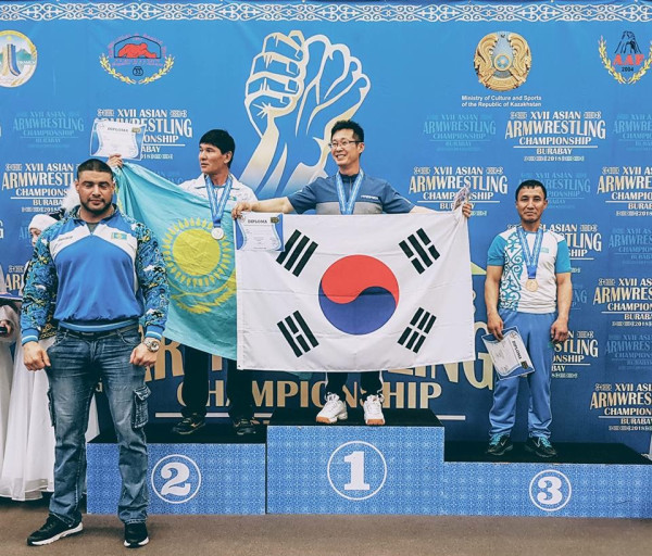 경남 김해시 농업기술과에 근무하는 서상진(48·공무직)씨가 카자흐스탄에서 열린 제17회 아시아팔씨름 챔피언쉽 65kg급에서 한국인 최초로 우승을 차지하고 태극기를 펼쳐들고 있다. 서상진 선수는 전승무패로 우승했으며, 아시아팔씨름연맹(AAF) 챔피언쉽에서 한국 선수가 우승을 한 건 이번이 처음이다.