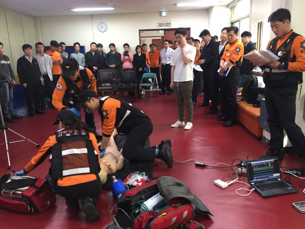 종로소방서는 지난 20일 중증응급환자에 대한 신속한 응급처치로 소생률 향상을 위해 종로소방서 펌뷸런스 운영요원을 대상으로 '팀 CPR훈련'을 실시했다. 사진은 심폐소생술 및 자동제세동기 사용 숙달훈련이 진행 중인 모습. (사진제공=종로소방서)