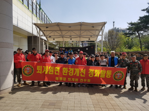 해병대 경기 남양주시 퇴계원전우회는 지난 21일 퇴계원중고등학교 학생등 300여명과 함께 퇴계원면 청소년 환경 정화활동을 실시했다. 이번 활동은 지역을 3개 코스로 나눠 진행됐다. 사진은 환경 정화활동을 개념해 퇴계원중 학생들과 해병대전우회 회원들이 기념촬영을 하는 모습. (사진제공=남양주시청)