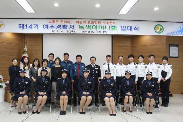 경기 여주경찰서는 지난 19일 경찰서 대강당에서 가남·세종·여주·여흥·오학·점봉초등학교 학부모 등이 참석한 가운데 ‘제14기 녹색어머니회 발대식’을 개최했다. 사진은 발대식에 참여한 학부모들이 기념촬영을 하는 모습. (사진제공=여주경찰서)