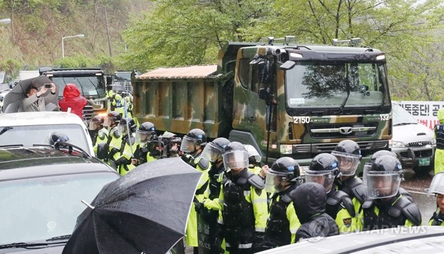 23일 오전 경북 성주군 초전면 소성리 사드(THAAD·고고도 미사일 방어체계) 기지로 공사 차량이 들어가고 있다.