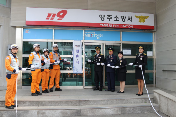 경기 양주소방서는 지난 20일 서장, 의용소방대 연합대장 등 47명이 참석한 가운데 119구급대 발대식을 개최했다. 사진은 참여자들이 현판 제막식을 진행하는 모습. (사진제공=양주소방서)
