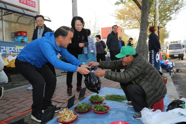 경기 안성시는 지난 21일 안성아양주공아파트 뒤 아양로변 일원에서 안성농업인새벽시장 운영협의회 주관으로 ‘2018년 안성농업인 직거래 새벽시장’을 개장했다. 사진은 직거래 새벽시장을 찾은 시장 등의 관계자들이 물건을 구매한 후 상인과 이야기를 나누는 모습. (사진제공=안성시청)