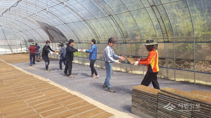 충남 아산시 대중교통과는 최근 1부서1촌 자매결연 마을인 송악면 동화2리의 농가를 방문해 봄철 농촌일손돕기를 실시했다. 사진은 직원들이 모판을 비닐하우스 안에 펼치고 있는 모습.(사진제공=아산시청)