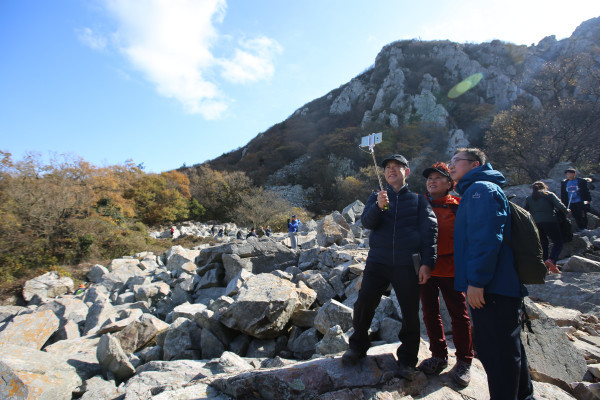 | ▲ 해남 달마산 17.74km의 둘레길 '달고도'를 찾은 상춘객들이 바위암릉을 배경으로 셀카를 찍고 있다. (사진제공=해남군청) | ||