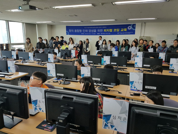 마포구가 홍익대학교와 손을 잡고 기획한 ‘창의 융합형 인재 양성을 위한 피지컬 코딩교육’ 최근 개강했다. 코딩교육은 오는 7월28일까지 매주 토요일 오전 10시 진행된다. 사진은 첫 강의에 참석한 학생들이 교육받고 있는 모습. (사진제공=마포구청)