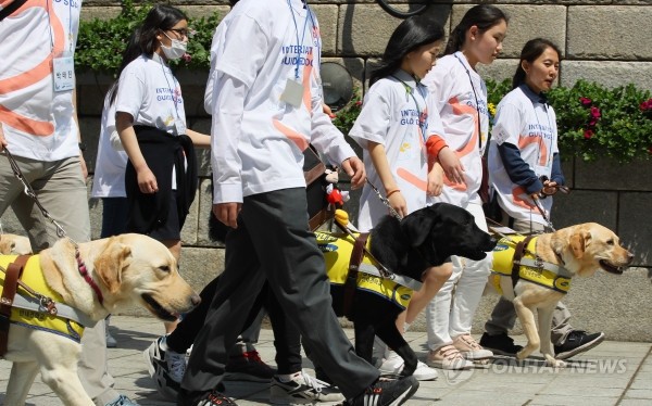 '세계안내견의 날'을 맞아 25일 서울 청계광장에서 삼성화재 안내견학교 주최로 열린 '안내견 보행체험'에서 사람들이 안내견, 안내견 훈련사와 함께 보행체험을 하고 있다.