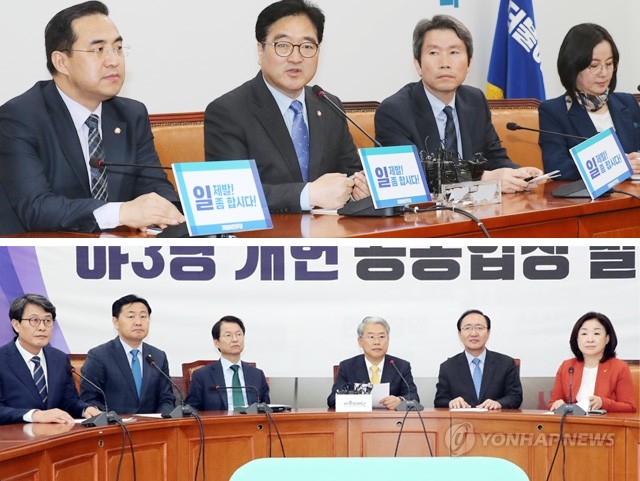 더불어민주당이 25일 6.13 지방선거와 개헌 동시투표가 무산됐다는 입장을 밝혔다. 우원식 원내대표가 이날 국회에서 열린 의원총회 모두발언에서 “우선 6월 지방선거 동시투표는 불가능해졌다”며 개헌 무산 관련 당의 입장을 설명하고 있다(위). 바른미래당·민주평화당·정의당 원내대표와 헌정특위 간사들이 25일 국회에서 야3당 개헌 공동입장을 발표하고 있다. 왼쪽부터 민주평화당 김광수·바른미래당 김관영·민주평화당 천정배·바른미래당 김동철·정의당 노회찬·정의당 심상정 의원.