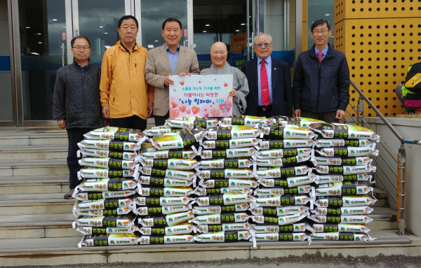 사단법인 대한불교 관음사는 지난 24일 경기 포천시 소흘읍에 지역 소재 경로당 38곳과 저소득 취약계층 가구에 전달해 달라며 대한노인회소을읍분회에 쌀 120포(10kg)을 기탁했다. 사진은 관음사 및 읍 관계자들이 기탁식 후 기념촬영을 하는 모습. (사진제공=포천시청)