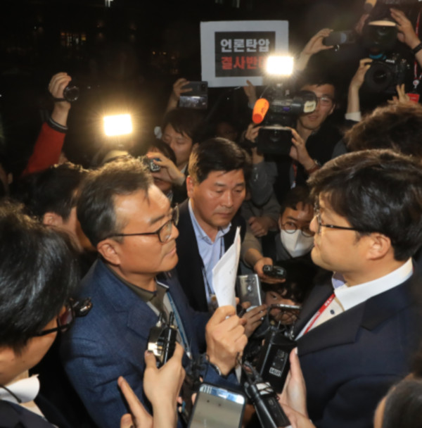 | ▲ 댓글 여론조작 혐의를 받고 있는 '드루킹' 김 모씨의 활동기반인 느릅나무출판사 절도사건을 수사 중인 경기 파주경찰서 소속 경찰들이 25일 오후 서울 중구 태평로 TV조선 본사를 압수 수색하기 위해 진입을 시도하다 언론탄압 중단을 주장하며 막아선 TV조선 기자들과 대치하고 있다.(사진제공=연합뉴스) | ||