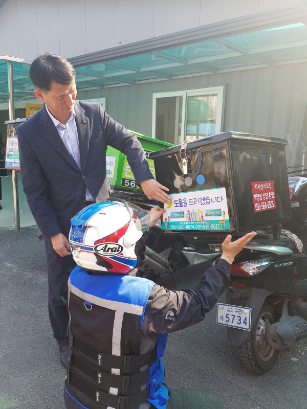 | ▲ 25일 협약식 후 센터 관계자가 배달 오토바이에 복지사각지대 발굴을 위한 홍보안내문을 부착하는 것을 살펴보고 있다. (사진제공=남양주시청) | ||