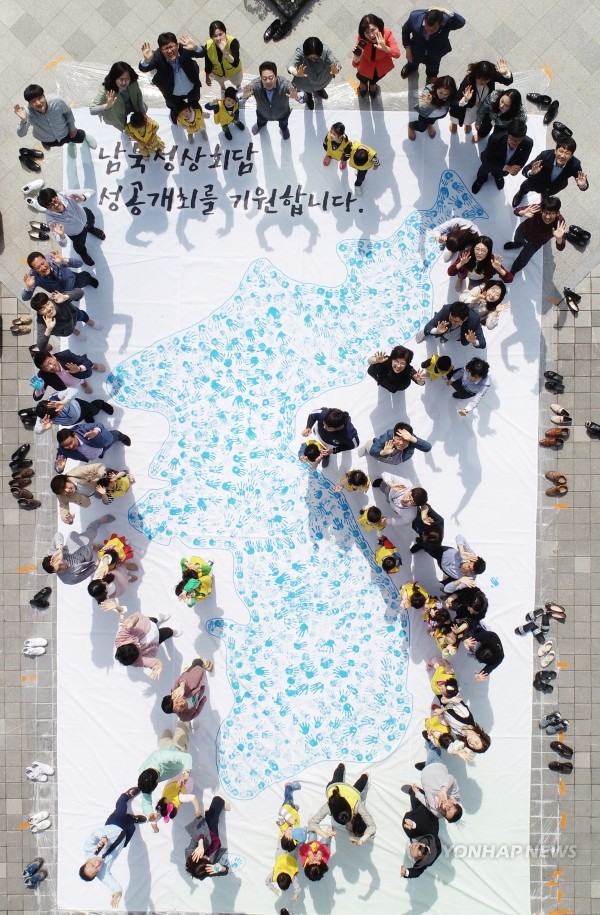 남북정상회담 개최를 하루 앞둔 26일 오전 광주 북구청 광장에서 구청 직원들과 어린이집 어린이들이 한반도에 손도장을 찍는 퍼포먼스를 하며 남북정상회담 성공개최를 기원하고 있다.