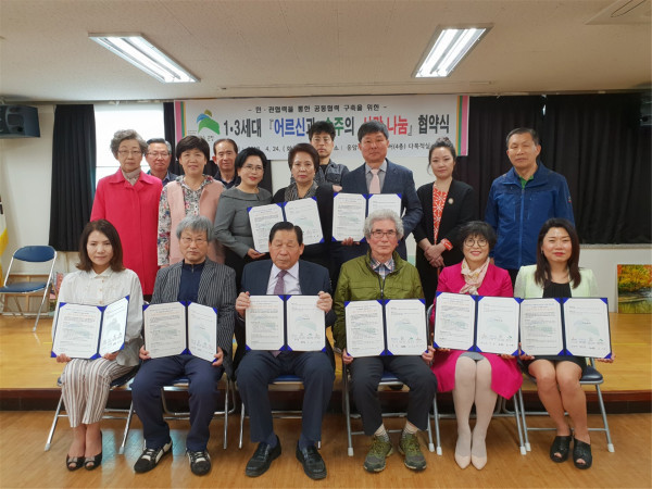최근 서울 은평구 응암2동 지역사회보장협의체가 지역내 3곳 경로당과 경로당 인근 3곳 어린이집과 ‘어르신과 손주의 사랑나눔’ 결연협약을 맺고, 상호교류·협력을 통해 복리증진을 위해 필요한 사항을 지원하기로 결정했다. 사진은 협약을 맺은 후 기념 촬영하고 있는 관계자들의 모습. (사진제공=은평구청)