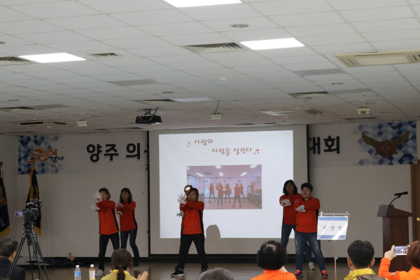 경기 양주소방서는 지난 25일 양주문화예술회관 대회의실에서 의용소방대원의 역량을 강화하기 위해 의용소방대 심폐소생술·생활안전강사 경연대회를 개최했다. 사진은 참여자들이 심폐소생술 관련 공연을 펼치는 모습. (사진제공=양주소방서)