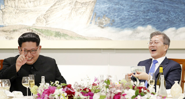 문재인 대통령과 김정은 국무위원장이 지난 27일 오후 판문점 평화의 집에서 열린 남북정상회담 환영만찬에서 마술공연을 관람하고 있다.