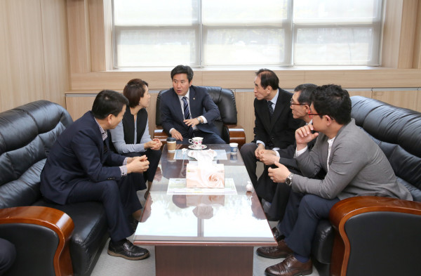서울 서대문구의회는 최근 2017회계연도 결산검사 위원으로 장숙이 의원(대표위원) 등을 위촉하고 결산검사에 돌입했다. 사진은 김호진 의장이 결산검사 위원들과 환담을 나누는 모습. (사진제공=서대문의회)